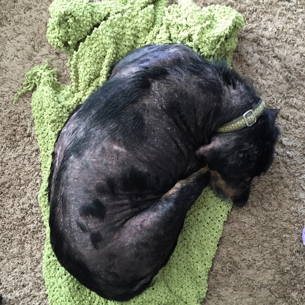 We brought him home and quickly discovered that his hairlessness was far worse than just being a stray dog with skin infection. He had mange and what we’d eventually discover to be allergies to basically everything. His skin would flare up 2-3 times a year, falling out and oozing with infection, and we’d spend 2-3 months trying to clear it up and get his hair to grow back. We spent thousands on vet visits, medication and specialists. He was allergic to everything. In the past 2 years, his health declined and he was having mobility issues and trouble moving his hips.
